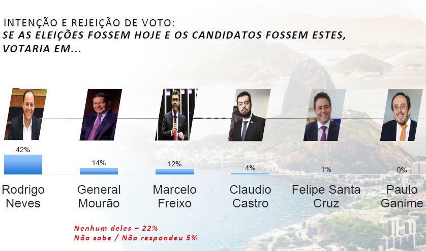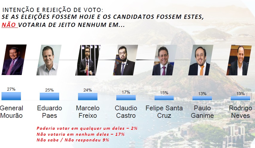 O Gerp também apresentou aos entrevistados um lista de nomes para avaliar a rejeição dos eleitores aos possíveis candidatos. O general Hamílton Mourão lidera a lista, com 27%, seguido do prefeito do Rio, Eduardo Paes (25%), ded Marcelo Freixo (24%), Cláudio Castro (17%), Felipe Santa Cruz (15%) e, por último, Paulo Ganime e Rodrigo Neves empatados com 13%.
